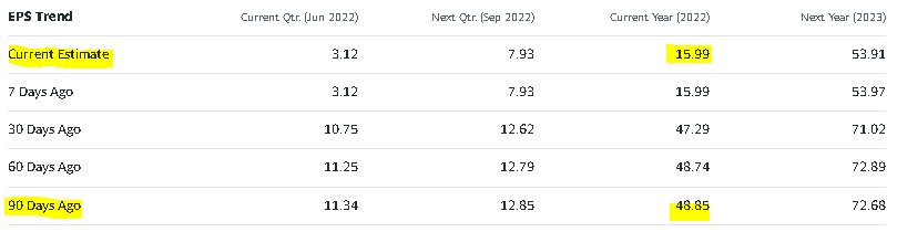 例えば、以下はAmazonの2022年のEPSについて足元の予想(15.99ドル)と、90日前の予想(48.85ドル)になります。