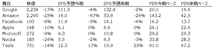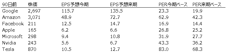 Yahoo finaniceの数字をもとにGAFAM+Nvidia、Teslaの90日前(2022/2/末)の株価、予想EPSをみていくと以下のようになっています。