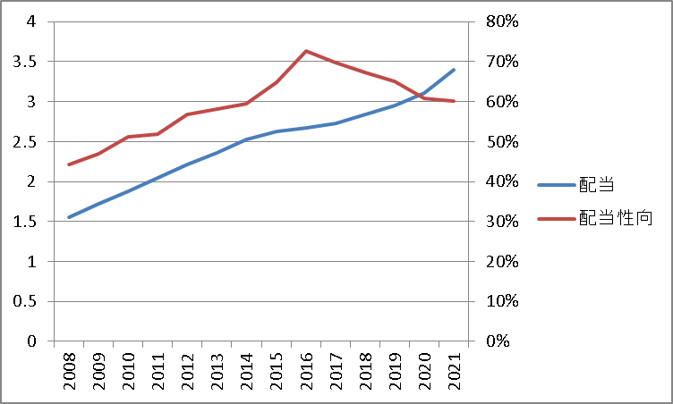 以下は同社の2008年~2021年の1株あたり年間配当(青:左軸)と配当性向(赤:右軸)の推移です。