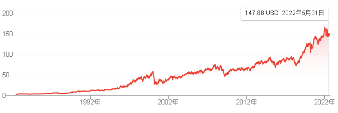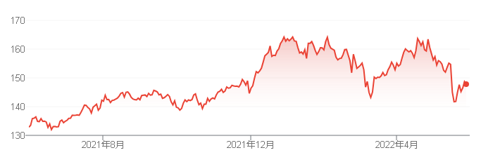 2022/5/31時点の株価は147.88ドルです。PERは26倍程度です。
