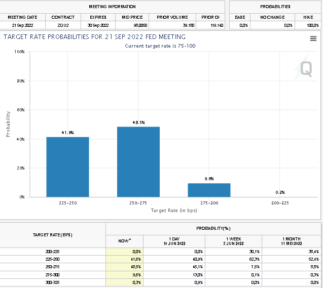 今回のCPI発表後、変化があったのは、その後の9月のFOMCで0.75%の利上げを予想する市場関係者が増えたことです。CPI発表前には7.5%、発表後は48.5%の市場関係者が9月に0.75%の利上げを予想しています。