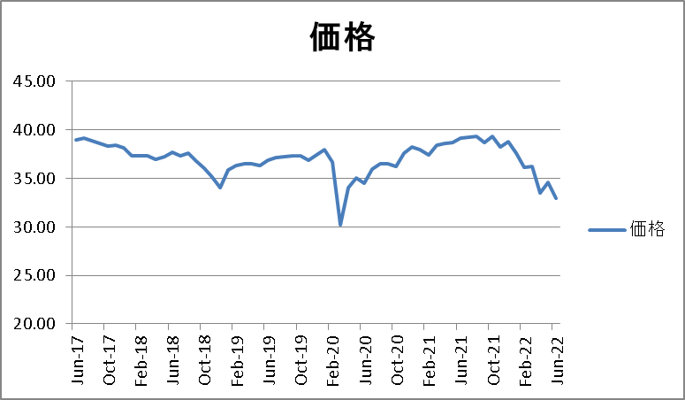 2022/6の価格は32.95ドルですので、約15%下落しました。