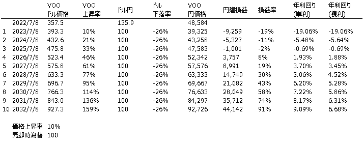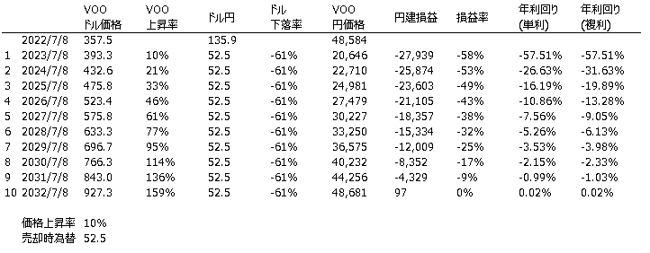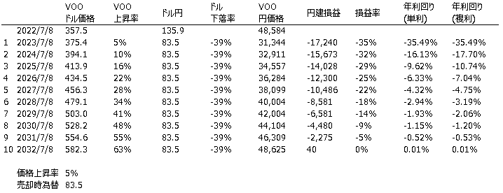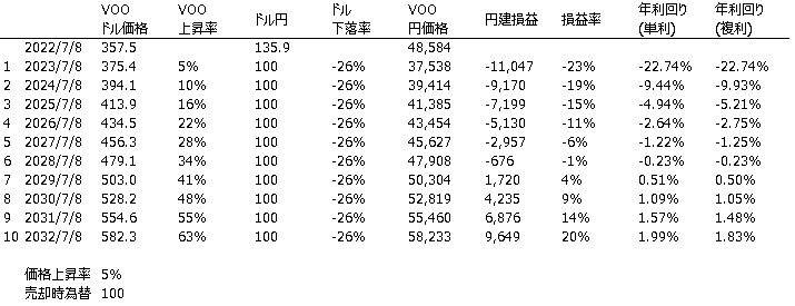 一方で、今後も過去同様の成長が見込めるかはわかりませんので、米国株の今後のリターンをもう少し保守的な数字でみた場合でも、円高になっても損をしないかを見ていきます。