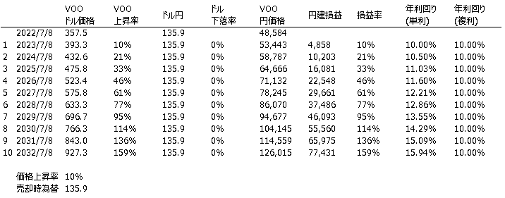 この場合、年利10%の株価上昇率と同じ10%が円建てでの年利回りとなります。