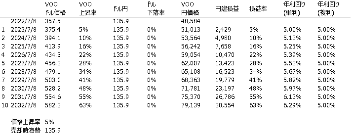 この場合の結果は、ドル建てリターンと同じ、年利回り5%です。