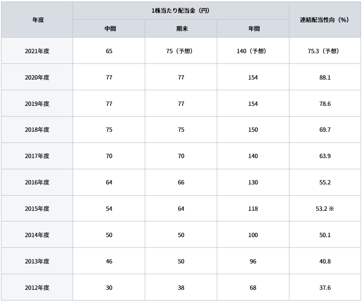 以下はJTの配当金の推移です。過去5年は140円以上ですので、この水準が続けばFIREが成立しますが、配当性向が75%と高いことや、5年以上前の配当額もみると、今後140円以上がずっと続くと自信を持つのは難しそうです。