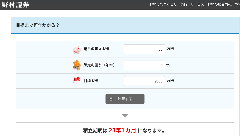 野村證券の「みらい電卓」で9,000万円を貯めるのに何年かかるかをシュミレーションすると、年4%で運用できる場合でも月20万円の積立を23年続けてようやく資産は9,000万円に達します。