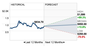 最低250ドル、最高1,580ドルと、見方にはかなりばらつきもあるようです。
