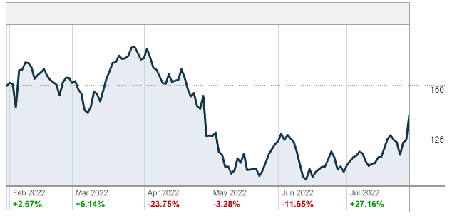 株価は7/29の現在時点で135ドル。PERは217倍です。