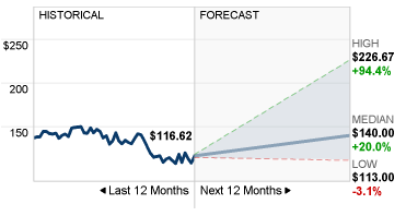 CNNビジネスの情報によるとアナリストの今後12カ月のアルファベットの株価予想平均は140ドルです。