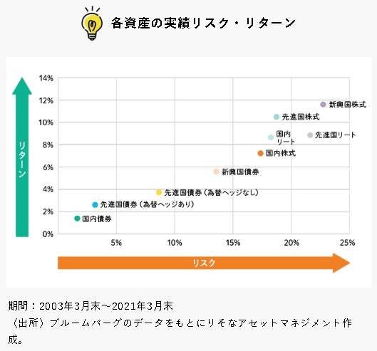 一方で、FIREは別にどちらでもいいので、確実に毎年資産を増やしていきたいという場合は、株式以外のアセットにも分散したアセットアロケーションでもよいでしょう。