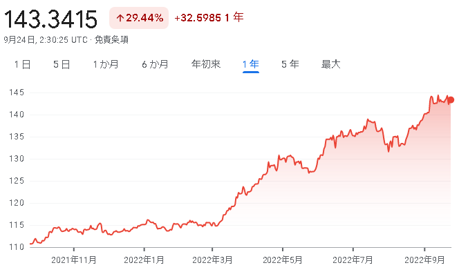 9/22には日本政府による24年ぶりの円買い介入が行われ、一時的に140円程度まで円高になりましたが、再び143円台に戻っています。