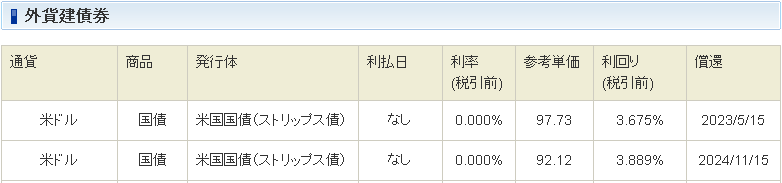 今回は、SBI証券の既発債のうち、2024/11/15償還期限の約2年の債券(以下表の2番目のもの)を使います。
