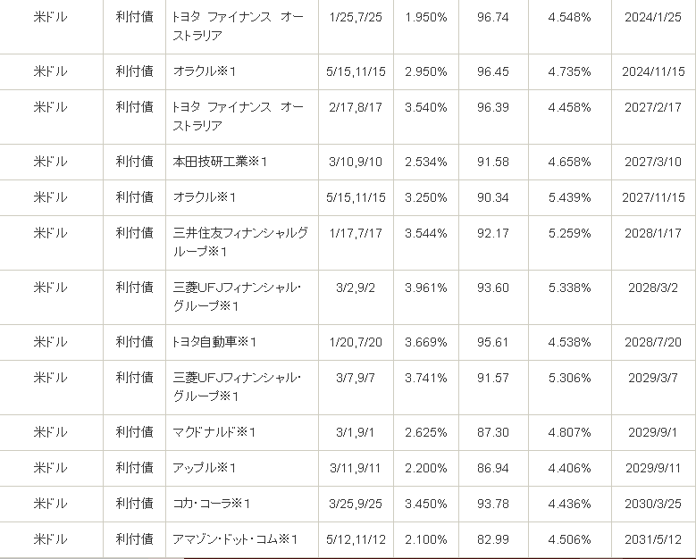 トヨタ自動車や本田技研工業の5~6年の社債で4.5%、MUFGやSMFGの銀行社債であれば5.3%、マクドナルドやコカ・コーラの7~8年社債で4.5~4.8%の利回りが得られます。