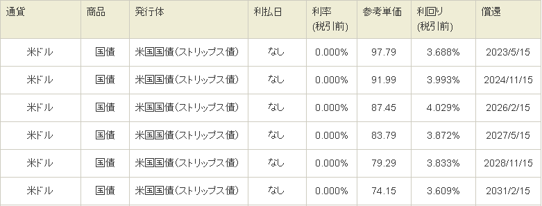 以下はSBI証券で売られている米国債の利回りです。