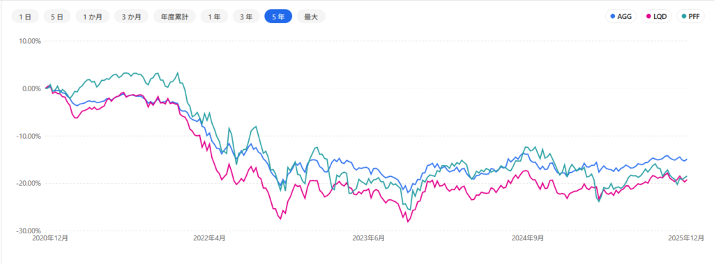 ドル建てチャートを確認すると、2022年の急激な金利上昇局面において、AGGはLQDやPFFと比較して下落幅が最もマイルドに抑えられていました。その結果、円建てでも唯一100%超を維持し、「暴落時のクッション」としての実力を証明しました。