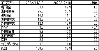 前回更新時(2022/11/19)から、約2.2百万円資産が増加しました。