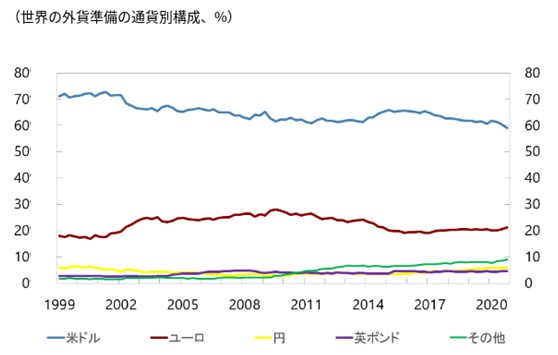 国際通貨基金(IMF)が行っている「公的外貨準備の通貨別構成(COFER)調査」によると、中央銀行の外貨準備に占めるドルの割合は59%です。