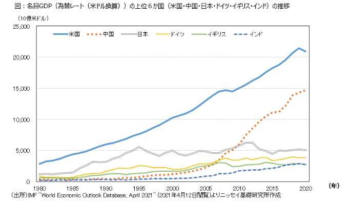以下はニッセイ基礎研究所さんの資料ですが、GDP上位6か国の推移です。