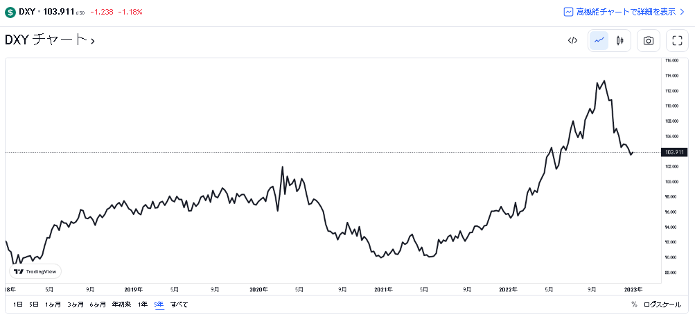 以下はドルインデックスの5年チャートですが、確かに2022年にドルは円だけではなく他の通貨に対しても上昇し、いまも5年では高値圏にあります。