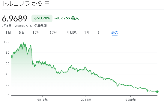 次にトルコリラ円ですが、こちらは更に変動が大きいです。