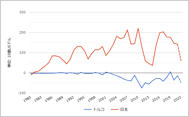 以下は南アフリカ、トルコと日本の経常収支の推移を比較したものです。