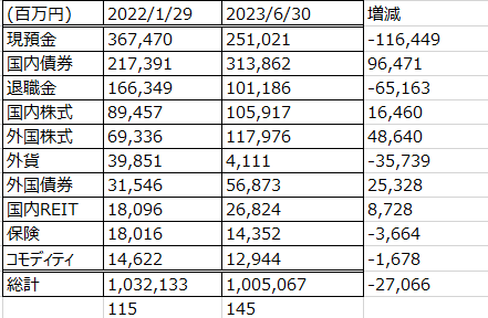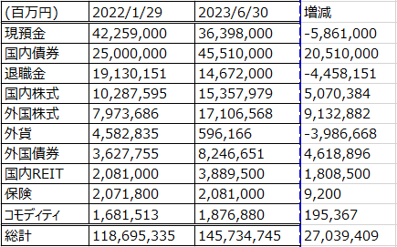 以下は、いまの円安傾向が始まる前の2022/1時点と直近2023/6時点の円ベースの資産推移です。
