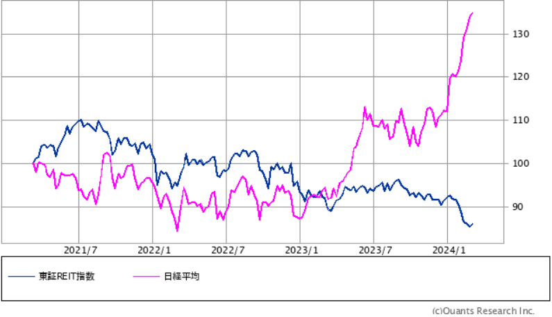 以下は過去3年の「東証REIT指数」と「日経平均株価」の推移です。