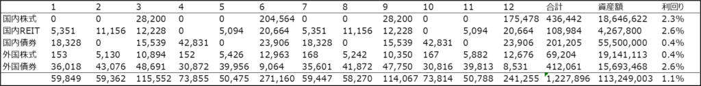 各資産カテゴリーごとの配当額、資産額、利回りは以下の通りです。