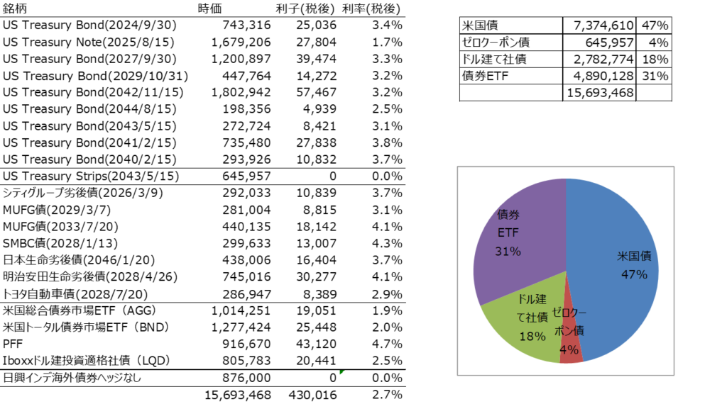 米国債が約半分、残りはドル建ての社債と債券ETFになります。