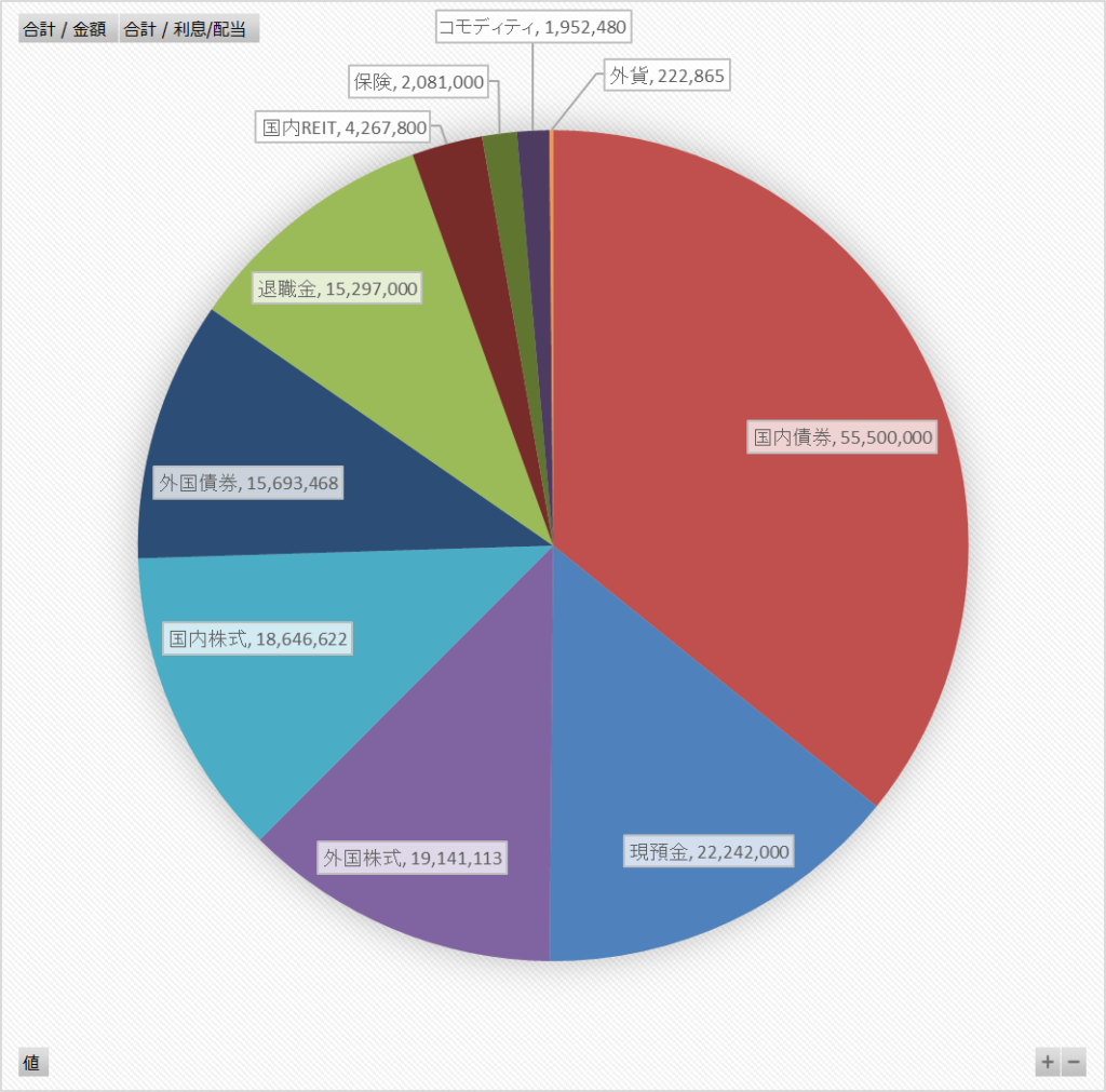 このうち、配当金や利息などの収入を生むものは、国内債券、外国株式、日本株式、外国債券、国内REITで、月10万円の配当金はこれらのカテゴリーの資産からのものです。