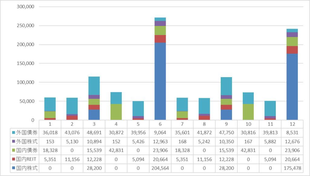 6、12月は国内株式の配当シーズンなので、配当金が大きくなっていますが、それ以外の月も50,000~100,000円ぐらいの配当収入があります。