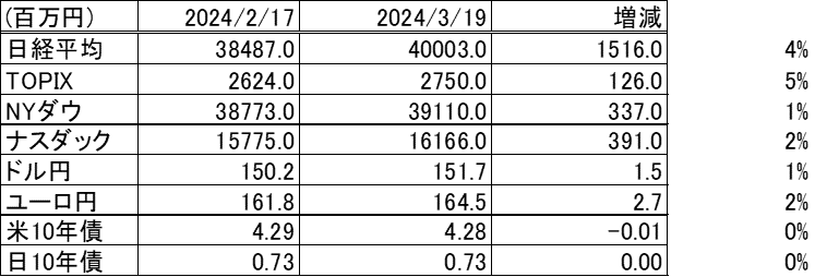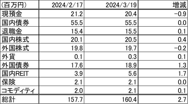 前回更新時(2024/2/17)から資産は約270万円増加しました。