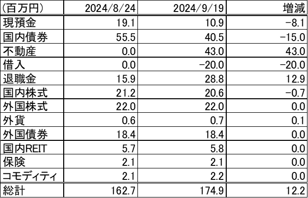 前回更新時(2024/8/24)から資産は約12.2百万円増加しました。