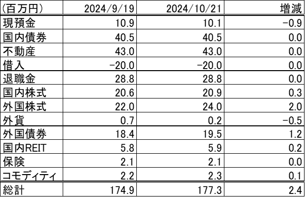 前回更新時(2024/9/19)から資産は約2.4百万円増加しました。
