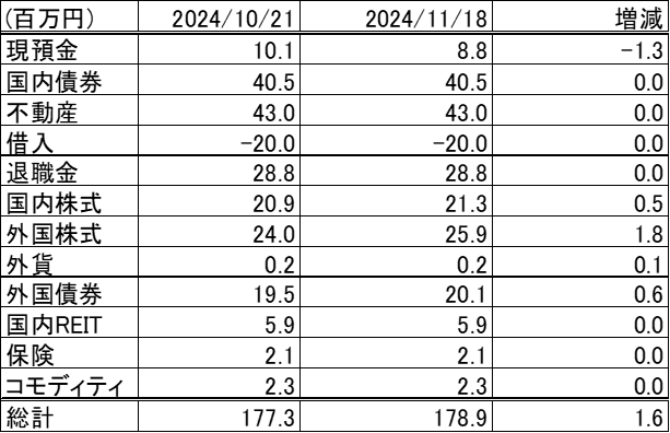 前回更新時(2024/10/21)から資産は約1.6百万円増加しました。