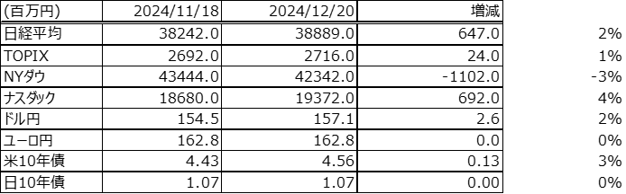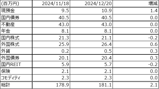 前回更新時(2024/11/18)から資産は約2.1百万円増加しました。