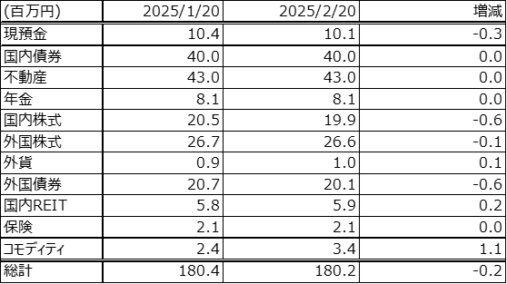 前回更新時(2025/1/20)から資産は約0.2百万円減少しました。