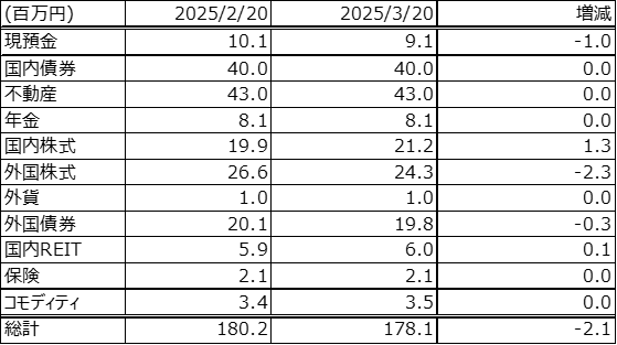 前回更新時(2025/2/20)から資産は約2.1百万円減少しました。