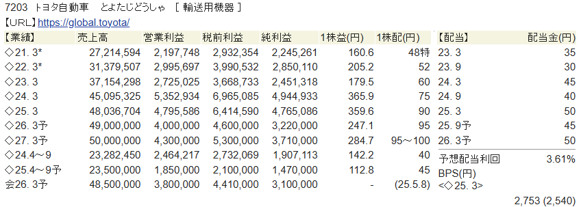 また、トヨタ自動車は、毎年安定して利益を上げており、配当性向も38.4%(26/3期予想ベース。1株配当95円/1株利益247円)と、26/3期の減益後でも十分余裕がある水準だったことも、評価しました。