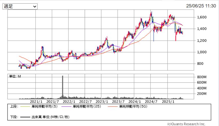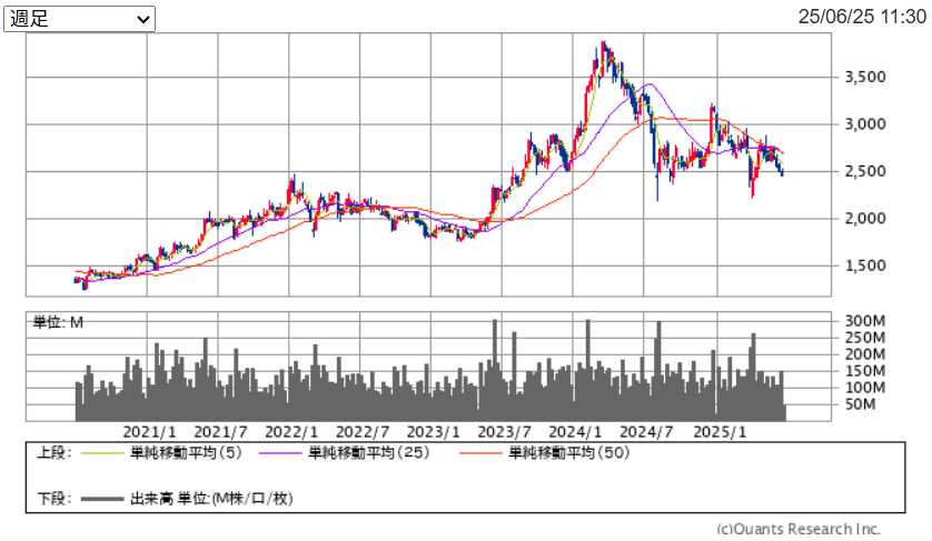 2024年3月の高値3,890円から、およそ36%株価は下落し、足元の株価は2,455円です。
