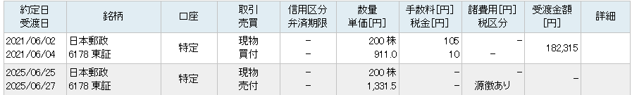 日本郵政は2021/6/2に911円で200株購入し、今回1,331円で全株売却しました。