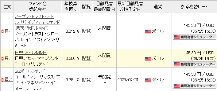 以下は楽天証券の例ですが、「外貨建てMMF」の利回りは3.6~3.8%もあります。