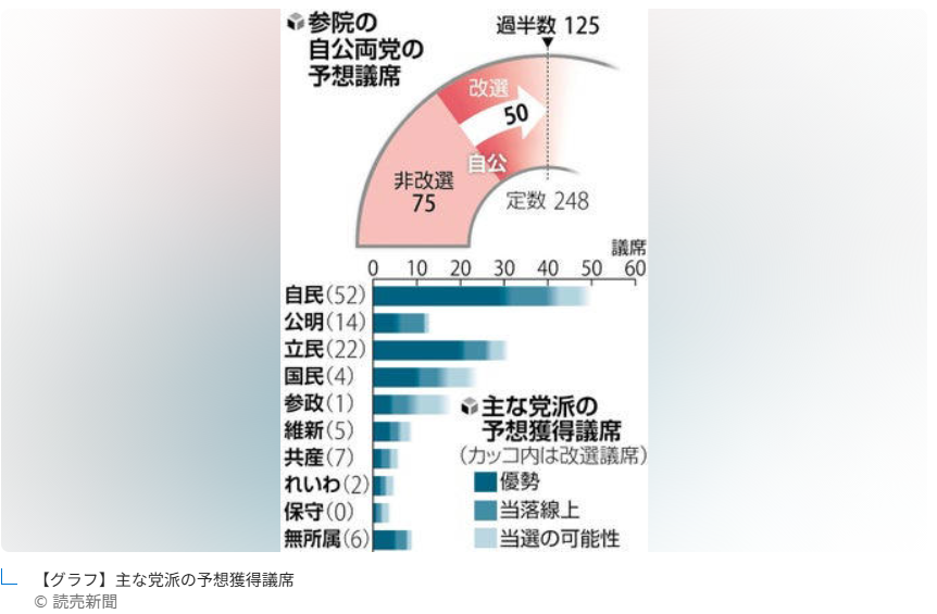 - 改選125議席のうち、与党(自民党・公明党)で50議席を獲得すれば、与党が参議院での過半数を維持できる(非改選75議席+今回の選挙50議席=125議席)。