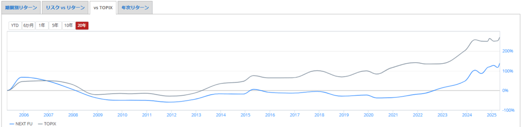 以下の通り、2006年頃からの20年スパンで見ると、低金利が長く続いた時代であったため、銀行株はTOPIXを大きくアンダーパフォームしています。