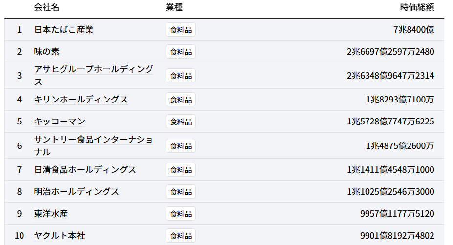 食料品業種の時価総額順位