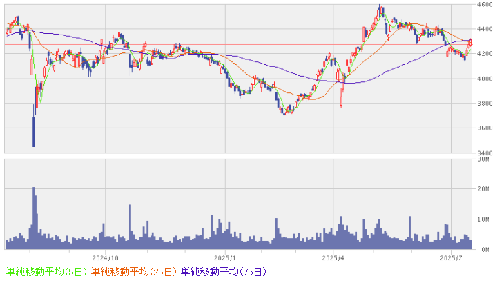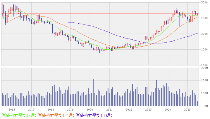 4月のトランプ関税ショック時には3,800円程度まで下落しましたが、現在は4,300円まで戻っています。