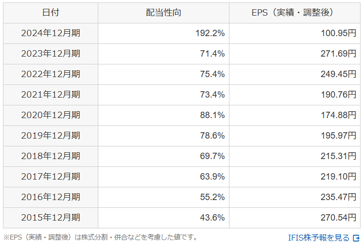 この影響を除くと配当性向は74.3%と会社発表にありますので、逆算すると、上記の一過性要因を除いた場合のEPSは261円ということになります。