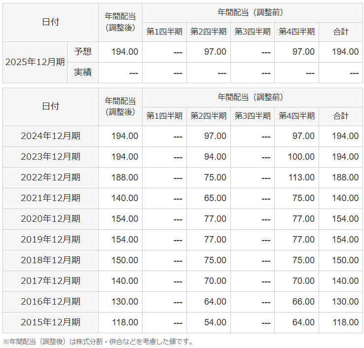過去10年の配当実績と25年12月期の予想です。
