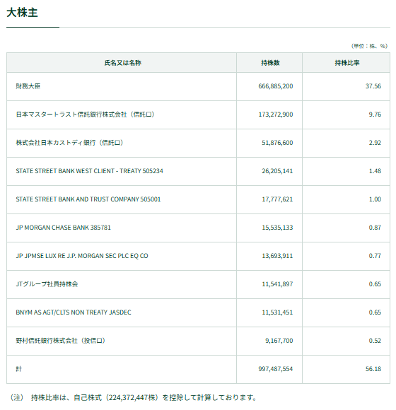 JT株の筆頭株主は財務大臣(国)です。
